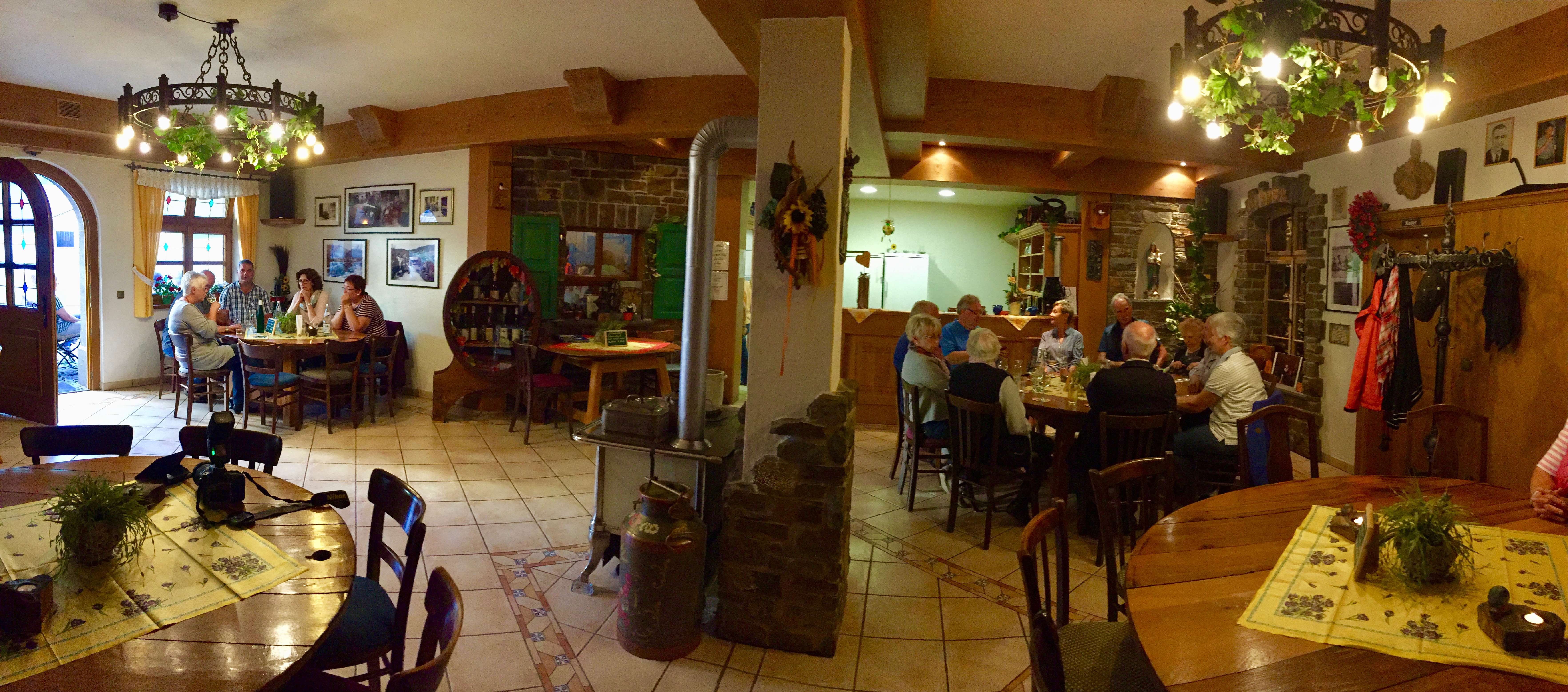 Reizvolle Atmosphäre, modern-rustikales Ambiente in hellem Holzdesign mit liebevollen Details. Ob drinnen oder bei schönem Wetter draußen, immer bei einem guten Glas Wein und einer deftigen Hausmannskost das örtliche Leben genießen.